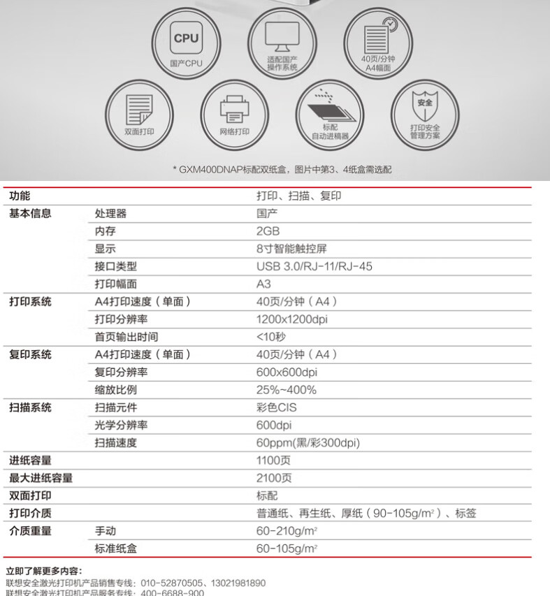 聯(lián)想(Lenovo)GXM400DNAP A3黑白多功能(打印/復印/掃描)40ppm/雙面打印/網(wǎng)絡(luò)打印/自動輸稿器(國產(chǎn)化)