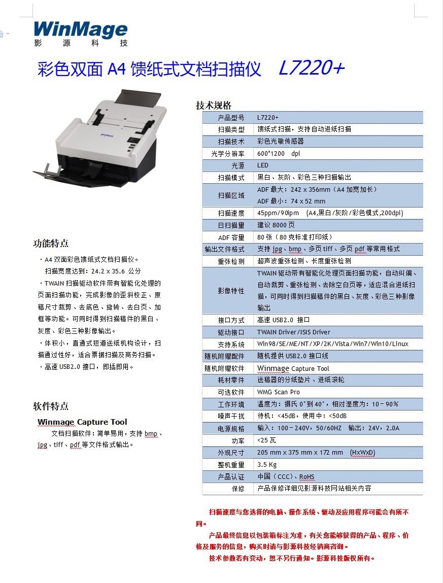 影源/WinMage L7220+ 掃描儀 國(guó)產(chǎn)彩色雙面A4饋紙式高速票據(jù)合同檔案掃描儀