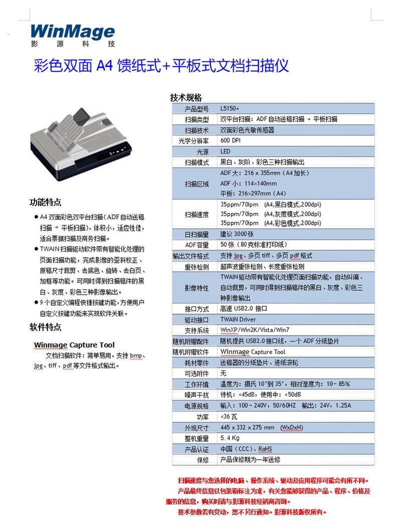 影源/WinMage L5150+ 掃描儀 國產(chǎn)彩色雙面A4饋紙式+平板式文檔掃描儀