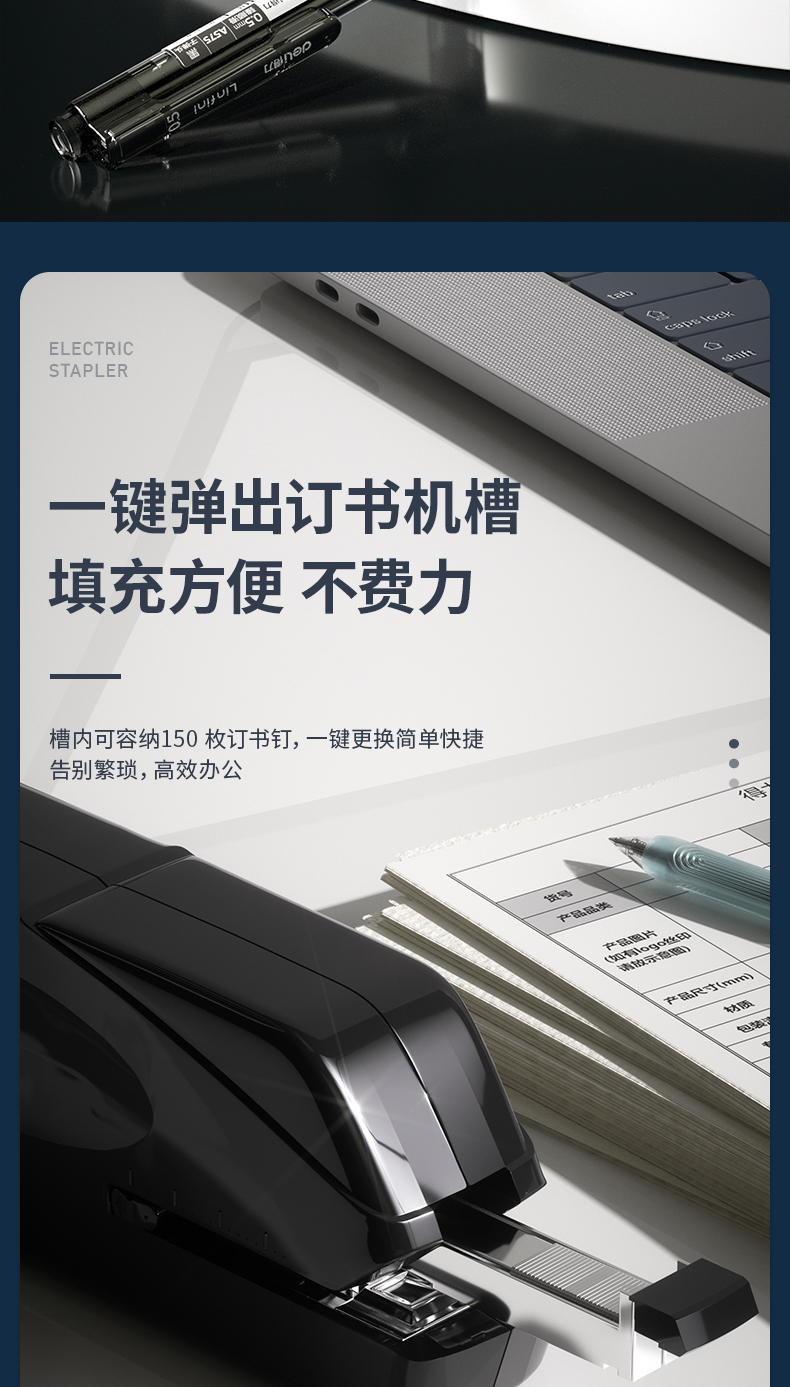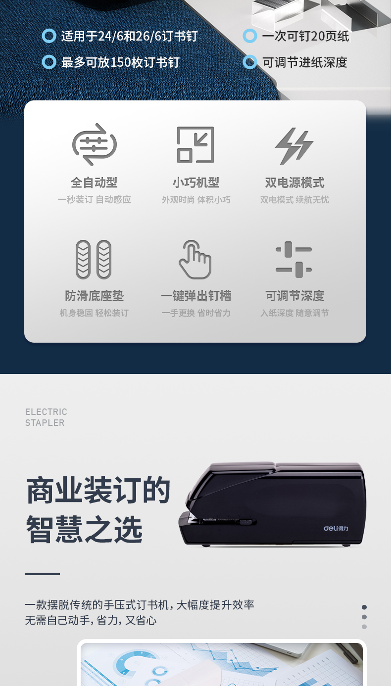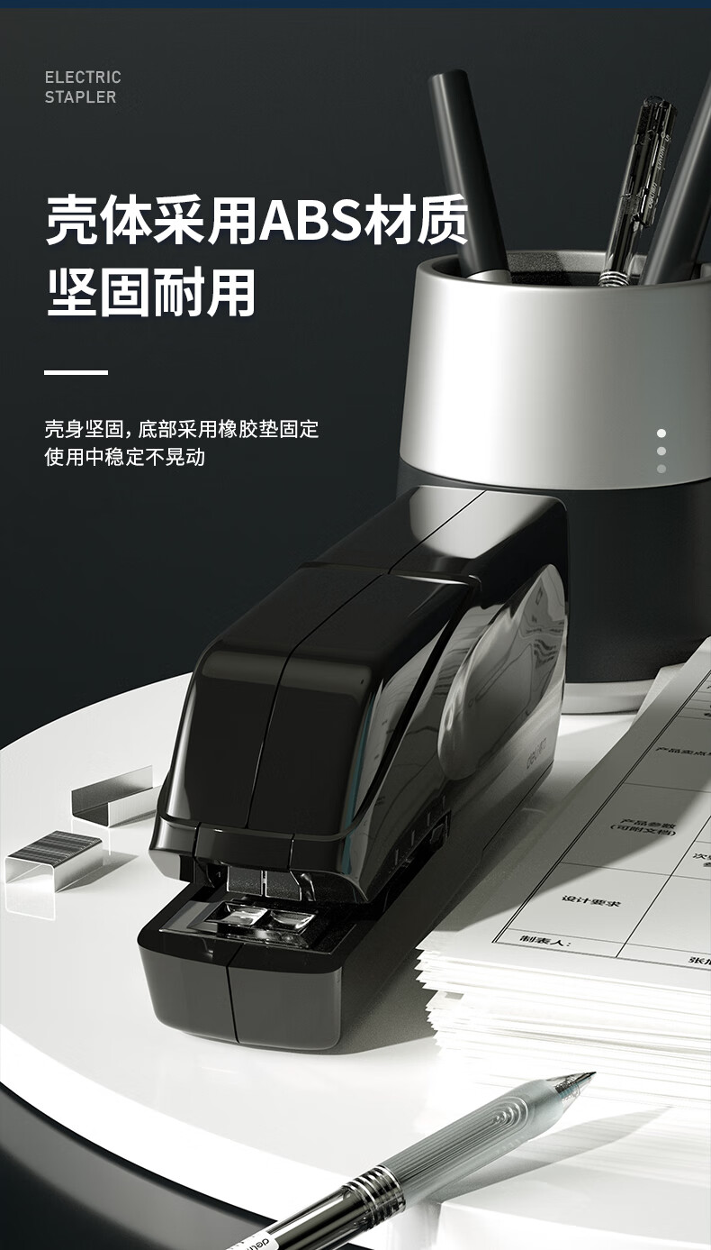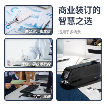 得力(deli)雙電源電動(dòng)訂書機(jī) 電子自動(dòng)裝訂訂書器 適配24/6或26/6訂書釘 辦公用品 黑色0489